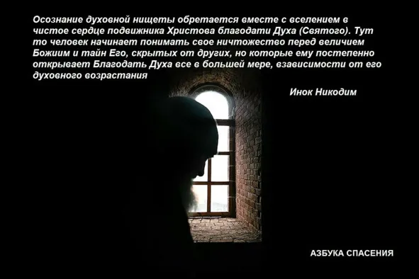 Для нищего духом и весь мир, яко ничто, везде он видит Одного Бога, все оживляющего и всем управляющего, нет у него места без Бога, нет мгновения без Бога – всюду и всякую минуту он с Богом и как бы с Ним Одним. Нищий духом не смеет и не думает постичь непостижимое, раскрывать тайны Божии, высокая мудрствовать, он верит одному слову Господа Жизнодавца, зная, что и каждое слово Его есть истина, дух и живот вечный, и словам Церкви Его, присно наставляемой Духом Святым на всяку истину, верит, как верит дитя отцу или матери своей, не требуя доказательств, полагаясь совершенно на них. Нищий духом считает себя последнейшим и грешнейшим паче всех, вменяет себя попранием всех.