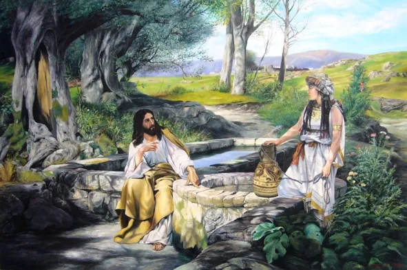 Приходит женщина из Самарии почерпнуть воды. Иисус говорит ей: дай Мне пить. Ибо ученики Его отлучились в город купить пищи. Женщина Самарянская говорит Ему: как ты, будучи Иудей, просишь пить у меня, Самарянки? ибо Иудеи с Самарянами не сообщаются. Иисус сказал ей в ответ: если бы ты знала дар Божий и Кто говорит тебе: «дай Мне пить», то ты сама просила бы у Него, и Он дал бы тебе воду живую. Женщина говорит Ему: господин! тебе и почерпнуть нечем, а колодезь глубок; откуда же у тебя вода живая? Неужели ты больше отца нашего Иакова, который дал нам этот колодезь и сам из него пил, и дети его, и скот его?