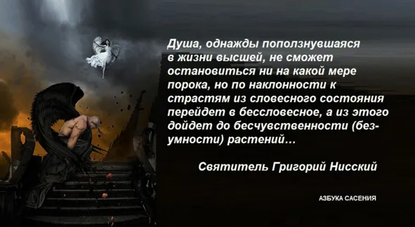 Душа, однажды поползнувшаяся в жизни высшей, не сможет остановиться ни на какой мере порока, но по наклонности к страстям из словесного состояния перейдет в бессловесное… Святитель Григорий Нисский