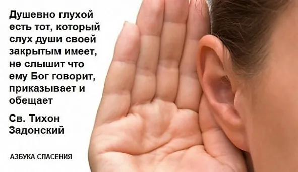 Поэтому всякий христианин должен стараться и молиться о том, чтобы внутренний слух души был отверст. Отсюда бывает начало как обращения и истинного покаяния, так и спасения. О бедный христианин, глухой христианин! Пробудись, пожалуйста, пробудись, и принуди себя, падай перед Иисусом, воздыхай и с усердием молись Ему, да откроет силой Своей Божественной слух души твоей, и тогда с охотою и радостью послушаешь голос Господень. О Иисус, Сила и Надежда нашего спасения, открывающий очи слепым и слух глухим! Открой слух душ наших, да услышим Божественное слово Твое. Скажи и нашей грешной душе: «еффафа», то есть: «отверзись» – и откроется слух ее. Признаки душевной глухоты: 1) Когда христиане слышат слово Божие и не исправляются. 2) Любовь к миру сему, то есть к чести, славе, богатству, роскоши и сластям. Эту глухоту сатана шептанием своим устраивает, чтобы люди не могли слышать слово Божие и так бы погибли.
