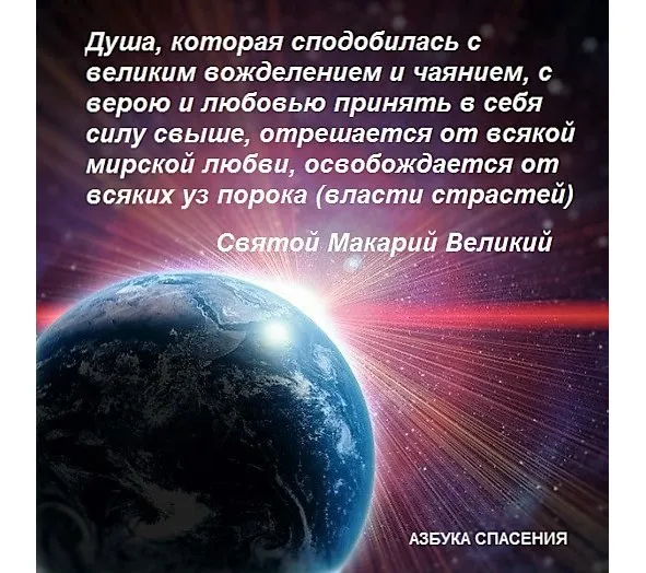 Душа, которая сподобилась с великим вожделением и чаянием, с верою и любовью принять в себя силу свыше, отрешается от всякой мирской любви… Святой Макарий Великий