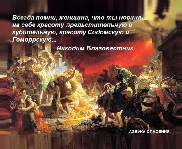 Всегда помни, женщина, что ты носишь на себе красоту плотскую, прельстительную и губительную, красоту содомскую и гоморрскую, соблазном которой явился гнев Божий в виде огня с неба, попаливший древние города вместе с их развращенными жителями. Если Господь сподобил тебе родиться женщиной, то родилась ты и человеком со всеми обетованиями Спасителя к наследию вечной жизни. И если хочешь достигнуть сего, навсегда забудь, что ты женщина и всегда помни, что ты человек.