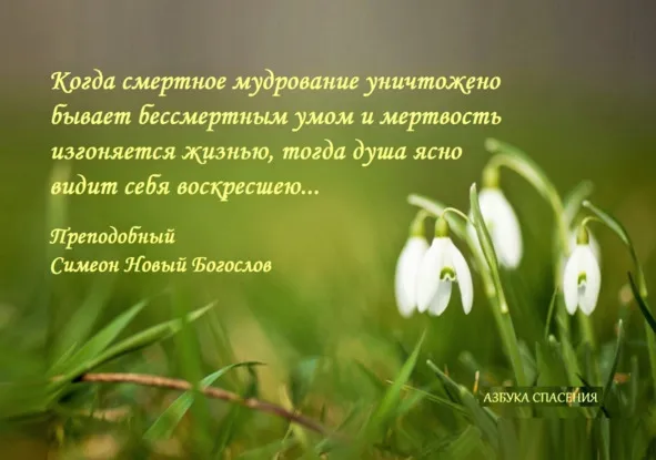 Так-то, братия, бывает смерть, или умертвие прежде смерти тела, и прежде воскресения тел бывает воскресение душ, – действительное, опытно сознаваемое, истинное. Ибо, когда смертное мудрование уничтожено бывает бессмертным умом и мертвость изгоняется жизнью, тогда душа ясно видит себя воскресшею, как пробудившиеся от сна видят себя бодрствующими, – с сознанием, что это Бог воскресил ее, – познав Коего и возблагодарив, поклонение Ему приносит и славословит беспредельную Его благость. Тело же после того не имеет уже более никакого движения или воспоминания о своих похотениях и стремлениях, но бывает для них совершенно мертво и бездыханно. Бывает даже нередко, что человек забывает самые естественные потребности, потому что душа его всегда мысленно привитает в том, что выше естества, как и подобает ей, ибо Писание говорит: духом ходите и похоти плотския не совершайте (Гал.5:16).