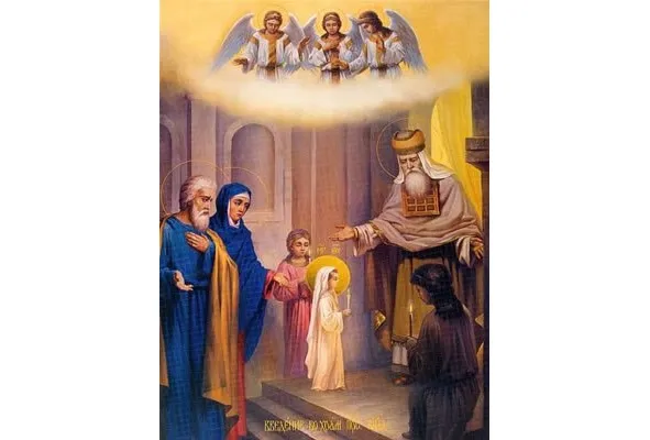 «Когда святая Дева пришла в возраст, священники составили между собою совет, как Ее устроить, чтобы им не оказаться оскорбителями Ее святого тела, опасаясь, что совершат грех святотатства, если выдадут замуж и подчинят закону супружества Ту, Которая раз навсегда принадлежала лишь одному Богу; в то же время они говорили, что не подобает девице, достигшей такого возраста, пребывать во святилище, что сего закон не допускает, и сие недостойно и не приличествует святыне. И вот, приступив к кивоту завета и сотворив усердную молитву, они, как повествует блаж. Иероним, получили ответ от Господа, чтобы искали такого достойного мужа, коему бы могла быть вверена дева под видом и образом супружества для хранения непорочного девства. Относительно же того, как найти такого мужа, совет Господень был таков: из дома и племени Давидова избрать безбрачных мужей и положить их жезл в алтаре – чей жезл процветет, тому святая Дева и должна быть вверена. В то самое время наступил праздник Освящения храма, установленный Маккавеями; начало праздника было 25 ноября, а отдание 3 декабря.