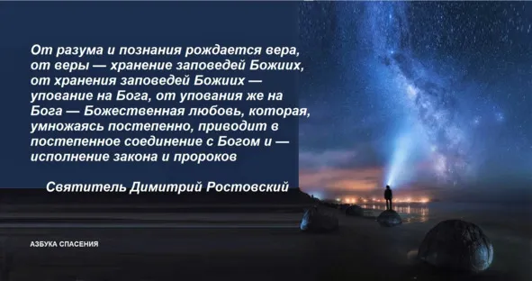 От разума и познания рождается вера, от веры – хранение заповедей Божиих, от хранения заповедей Божиих – упование на Бога, от упования же на Бога – Божественная любовь, которая, умножаясь постепенно, приводит в постепенное соединение с Богом и – исполнение закона и пророков.
