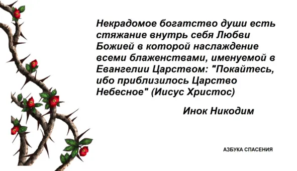Богатство некрадомое есть духовное богатство внутреннего, обновленного Святым Духом человека, которое есть вера, любовь, смирение, целомудрие и покой (божественная свобода от насилия страстей). Человек, по приходу в бытие (рождении), имеет дарованные свыше свободную волю и власть, которые может использовать на свое усмотрение и направлять их на то, куда сам пожелает: будь то злые дела (грехи) или добрые. Но человек настолько немощен и слаб, что ничего от себя делать не может: Без Меня не можете делать ничего (Ин.15:5), а только показывает намерение (желание) своей воли. Реализуют же его намерения и приводят в исполнение скрытые от плотских глаз духовные силы: в добрых делах вспомоществует Господь и ангелы Его, а в злых – бесы и демоны страстей.