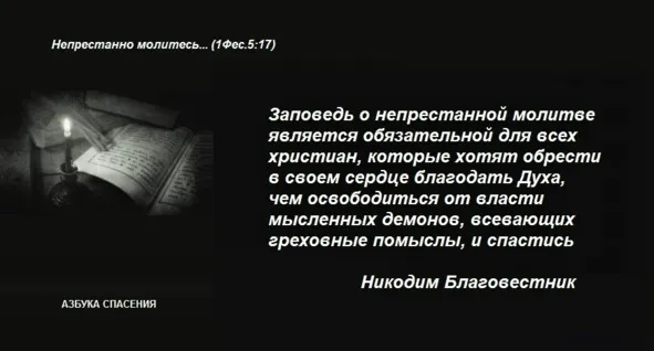 Твердо ведай, что непрестанная молитва та есть, которая не отходит от души ни днем, ни ночью и которая состоит не в воздеянии рук, не в положении тела молитвенном и не в возглашении молитв языком, чтоб можно было ее видеть телесными очами, но состоит в умном делании с памятованием о Боге при постоянном умилении, и уразумевается только умеющими уразумевать сие.