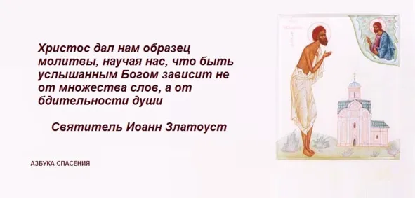 И, когда молишься, не будь, как лицемеры, которые любят в синагогах и на углах улиц, останавливаясь, молиться, чтобы показаться перед людьми. Истинно говорю вам, что они уже получают награду свою. Ты же, когда молишься, войди в комнату твою и, затворив дверь твою, помолись Отцу твоему, Который втайне, и Отец твой, видящий тайное, воздаст тебе явно. А молясь, не говорите лишнего, как язычники, ибо они думают, что в многословии своем будут услышаны; не уподобляйтесь им, ибо знает Отец ваш, в чем вы имеете нужду, прежде вашего прошения у Него. Молитесь же так: «Отче наш, сущий на небесах! Да святится имя Твое; да приидет Царствие Твое; да будет воля Твоя и на земле, как на небе; хлеб наш насущный дай нам на сей день; и прости нам долги наши, как и мы прощаем должникам нашим; и не введи нас в искушение, но избавь нас от лукавого. Ибо Твое есть Царство и сила, и слава во веки» (Мф.6:5—13).