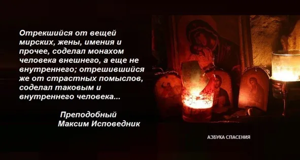 Отрекшийся от вещей мирских, жены, имения и проч., соделал монахом человека внешнего, а еще не внутреннего; отрешившийся же от страстных помыслов, соделал таковым и внутреннего человека, т.е. ум внешнего человека легко сделать монахом, если только захотеть, но немал подвиг сделать монахом внутреннего человека.