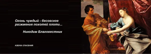 Была же заповедь Божия, твердо узаконенная под страхом смертной казни, чтобы никто из иереев не дерзал внести чуждый огонь внутрь скинии Божией. Случилась же такая вещь: два сына Аароновы, Надав и Авиуд, не известно с каким намерением вложивши в кадильницы чуждый огонь, дерзнули внести его в скинию, где был огонь Божий, и тотчас за эту дерзость их постигло отмщенье и казнь, ибо и пламя, выйдя с жертвенника от огня Божия, сожгло их в пепел. Это перетолковано уже прежде, что жертвенник Божий таинственно изображал собою сердце человеческое, огонь же Божий означал любовь Божию, горящую в сердце. Но что такое «чуждый огонь»? Любовь к миру, которая является враждой к Богу, любовь к наслаждениям и страстям плотским, противным Богу, – вот что означает чуждый огонь. Кроме того, огонь ярости, огонь гнева, огонь злопамятства, – все это чуждые огни, крайне противные для любви Божией.