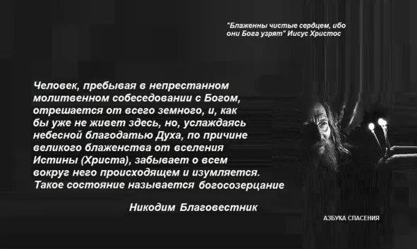 Сколько бы человек не подвижничал, ни прочитал духовных книг, ни молился или постился, но при всем этом был в плену у какой-либо «маленькой» страстишки своей, то никогда не вселится в его сердце Бог. Почему? Потому что, там где пребывает тьма, уже нет Света. Потому что Бог есть Истина, а бесы, приседящие каждой страсти, помрачают ум человека лживыми помыслами и он не может знать истину ясно, но видит с искажением, т.е. ложно, из за чего множество людей, еще не очистившихся от ветхих пороков, думая что идут верным путем, в действительности пребывают в духовной слепоте и прелести, т.е. ложном мнении о самих себе. Потому Господь для всех ясно указал в заповеди блаженств условие для познания Себя – Истины, это чистота сердца, т.е. бесстрастие.