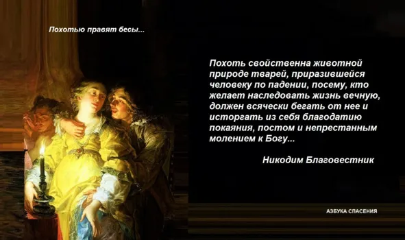 Корень срамной похоти есть человеческая похвала, как и целомудрия – обличение нас в грешности, не тогда, впрочем, когда слышим только, но и когда принимаем его на себя. Плоть похотствует на духа, а дух на плоть (Гал.6:17); ходящие же духом – похоти плоти не совершают. Как огонь не может укоснеть в воде, так и скверный помысл в боголюбивом сердце. Ибо всякий боголюбивый и трудолюбив, самоохотный же труд, естественно, есть враг похоти.