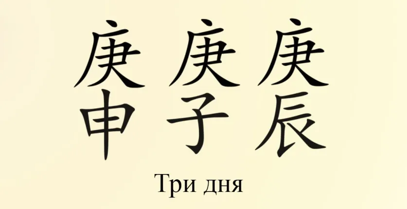 Записи на бамбуковых дощечках гласят: “День 庚 полностью встречается на «Всеувлажняющей поительнице» – табу на встречу с 丙丁巳午. Если в часе стоят 子申 – счастье и благополучие сокращается наполовину.