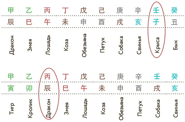 НС – Небесный ствол; ЗВ – Земная ветвь. По ней определяется Небесный ствол Земной ветви Дракона, ближайшей к искомому Небесному стволу часа, и, двигаясь в таблице по двенадцати Земным ветвям в строках 60 Цзя Цзы (в этом случае назад, поскольку Земная ветвь Крысы находится перед Земной ветвью Дракона), мы находим Небесный ствол часа – это Вода Ян 壬.