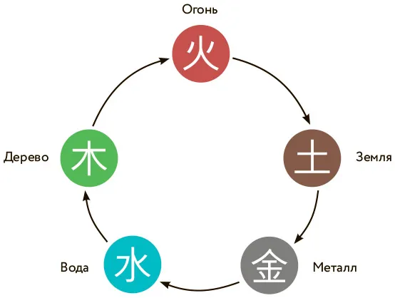 3. Круг преодоления, когда стихии конфликтуют друг с другом: Металл рубит Дерево, Дерево преодолевает корнями Землю, Земля впитывает Воду или образует для нее берега, Вода же тушит Огонь, который в свою очередь плавит Металл.