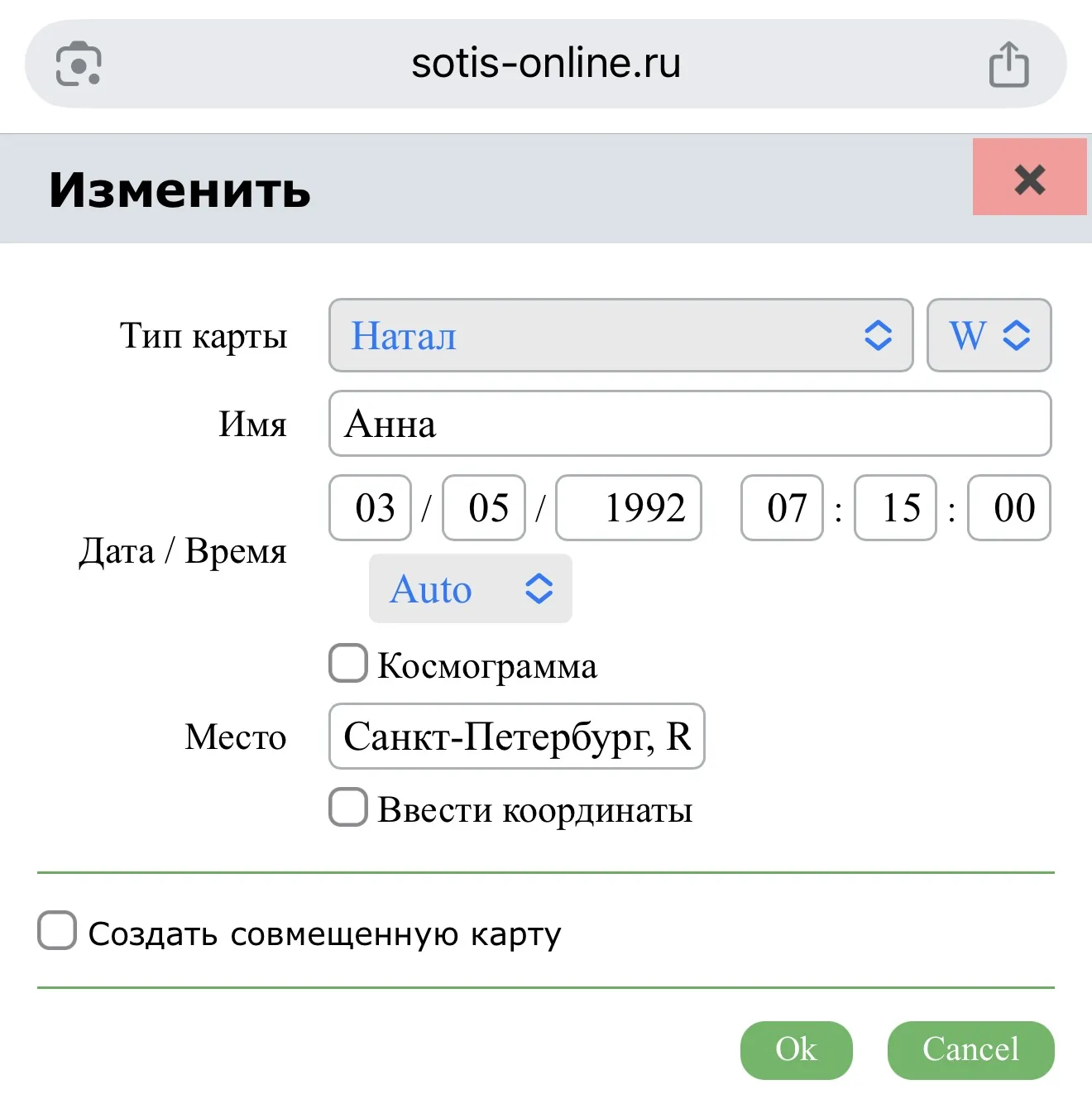 Вводим своим данные, дата рождения, место рождения, время рождения, после нажать «ок»