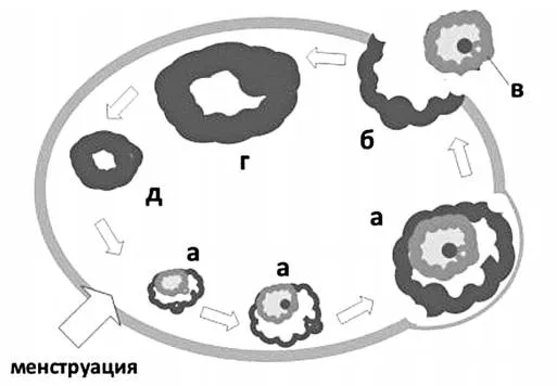 Рисунок 1. Строение яичника: а – созревание фолликула (ооцита); б – овуляция; в – яйцеклетка; г – расцвет желтого тела; д – регресс желтого тела