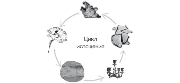 Для того чтобы представить круг истощения, нужно круг порождения «прочесть» не по часовой стрелки, а против нее. То есть, дерево питает огонь, и горя в костре, истощает свои силы. Вода питает дерево (вспомним наши цветы в вазе) и теряет свои силы. Металл питает воду и поэтому ослабевает. Земля вкладывает свои силы на рождение металла и теряет свою прежнюю мощь. Огонь питает землю и поэтому сам истощается.
