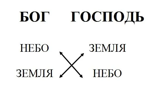 Для этого возьмём чистый лист бумаги и поделим по вертикали на две половинки, за-тем каждую половинку подпишем – в первой строке левой половинки напишем Бог, начиная со второй строки левой половинки пишем порядок творения Бога. У нас получается – вторая строка в колонке Бог – Небо, третья строка в колонке Бог – Земля. Теперь переходим на правую половинку листа, на против слова Бог, правую колонку подписываем – господь. Далее пишем порядок творения господа, а именно – на вторую строку пишем слово – Земля, а на третью строку пишем слово – Небо.