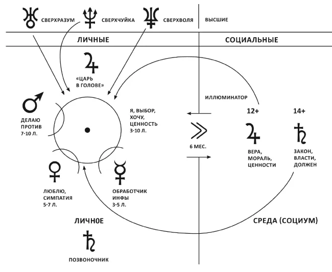 Совокупность мыслей (Меркурий) порождает отношение (весовская ипостась Венеры). Набор отношений создает убеждения (Юпи- тер). Сумма убеждений определяет вариант реализации будущего (Уран).