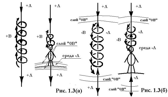 Для того, чтобы закрыться от Небесного Света, некоторые существа, в том числе и Человек, умеют создавать и поддерживать «среду –Л», при помощи своей энергии «–В», (вырабатывая энергию «–В»). В «среде –Л» возникает энергия «–Л», которая не совпадает по направлению с той энергией, движущейся навстречу ей энергией «+Л», т. е. Небесного Света. В местах встреч энергий происходит наложение этих энергий, частичное «пережигание», и возникают два слоя, названные нами «0В». Здесь происходит явление похожее на известное в физике как «явление интерференции» (наша версия). В самом слое «0В» энергии «+В» и «–В» также «перегорают» почти полностью, до «нуля», поэтому мы и назвали этот слой «нуль В» (0В), (см. рис. 1.4).