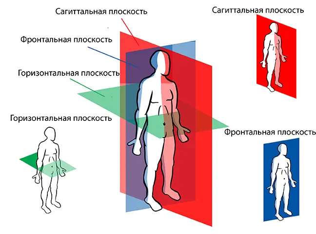 Оси и плоскости тела – это не какие-то реально существующие образования или части тела. Это воображаемые плоскости и линии, помогающие нам описывать человеческое тело и его движения. Для описания движений человеческого тела используются три плоскости: фронтальная, сагиттальная и горизонтальная; и три оси: фронтальная, сагиттальная и вертикальная.