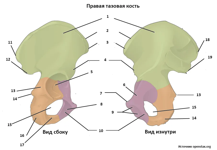 Костные ориентиры тазовых костей:1 – подвздошная кость, 2 – гребень подвздошной кости, 3 – верхняя передняя подвздошная ость, 4 – нижняя передняя подвздошная ость, 5 – вертлужная впадина, 6 – верхняя ветвь лобковой кости, 7 – бугор лобковой кости, 8 – нижняя ветвь лобковой кости, 9 – суставная поверхность лобкового симфиза, 10 – седалищно-лобковая ветвь, 11 – задняя верхняя подвздошная ость, 12 – задняя нижняя подвздошная ость, 13 – седалищная кость, 14 – седалищная ость, 15 – запирательное отверстие, 16 – седалищный бугор, 17 – ветвь седалищной кости, 18 – задняя верхняя подвздошная ость, 19 – задняя нижняя подвздошная ость.
