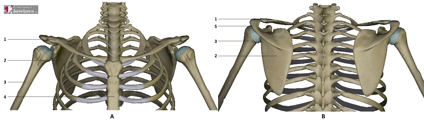 Скелет плечевого пояса: 1 – ключица, 2 – лопатка, 3 – плечевая кость, 4 – грудина, 5 – ость лопатки.