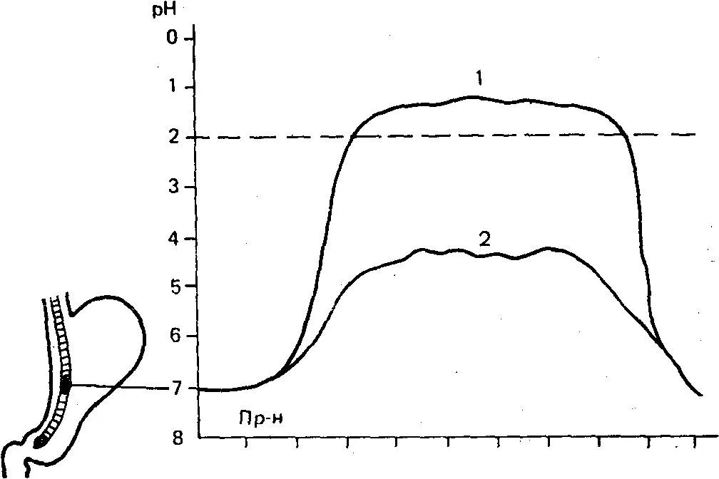 При первом варианте рН понижается в ответ на пробный стимулятор до уровня 2 и менее <2. При втором варианте рН в ответ на пробный стимулятор понижается, но не до уровня 2.