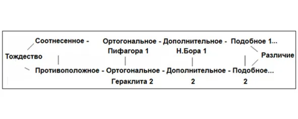 В моих работах 3показано, что лежащее между тождеством и различием отношение конкретного тождества, я разделил на множество конкретных различий, одним из которых и является отношение противоположностей. Но в отличие от Гегеля и всех других диалектиков, которые в противоположности видят самое большое различие, я, напротив, воспринимаю противоположность как самое малое различие, что хорошо видно из приведенной Схемы 5.