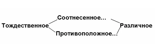 При этом один из аристотелевских видов противолежания – «противоречащее» – мы разделили на две части – на два совершенно самостоятельных сравнительных понятия: «Тождественное»: А = А. И «Различное»: А и не-А. Тогда как три других вида противолежания: «соотнесенное», «лишенность и обладание» и «противоположное», напротив, объединили в один вид, вводя для него общий термин – «градуальное».