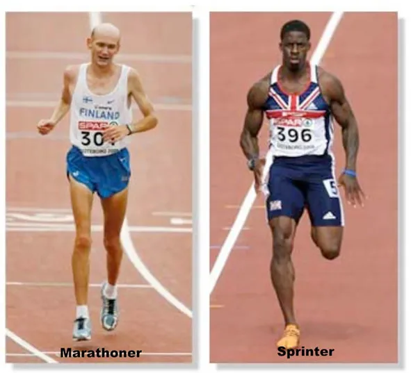Вот к примеру два атлета, один стаер (бегун на длинные дистанции) второй спринтер (бегун на короткие дистанции), обратите внимание на их мышечные кондиции, стаеры все сухие, поджарые, у них явно мышцы, которые высохли в результате нагрузок. А сейчас посмотрите на спринтера, обратите внимание, на сколько, хорошо развиты его мышцы. Вот вам два атлета и два вида абсолютно противоположных тренировочных режима. Это не означает, что один лучше другого, просто это два различных формата преодоления нагрузок. Стаеры сильны тем, что их организм вынослив к длительным нагрузкам, но слаб, когда предстоит коротко срочная, но очень мощная нагрузка, а спринтеры наоборот, как будто созданы для мощной и короткой нагрузки, но если нагрузка длительная, их организм не справится с ней. Все от того, что у скелетной мускулатуры есть два вида мышц-быстрые и медленные, медленные меньше подвержены утомлению и более выносливые, а быстрые способны к очень мощной работе, но быстро утомляются. В связи с этими особенностями, у марафонцев (стаеров) преобладают медленные типы мышц, а у спринтеров быстрые.