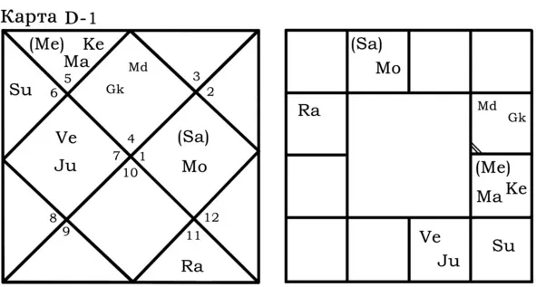 А вот пример гороскопа, в котором Gk играет важную роль для Марса и брачной жизни хозяина гороскопа. Упаграхи находятся в одном знаке с управителем 7-го дома.