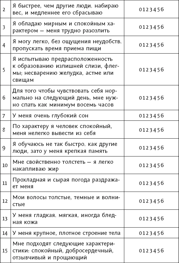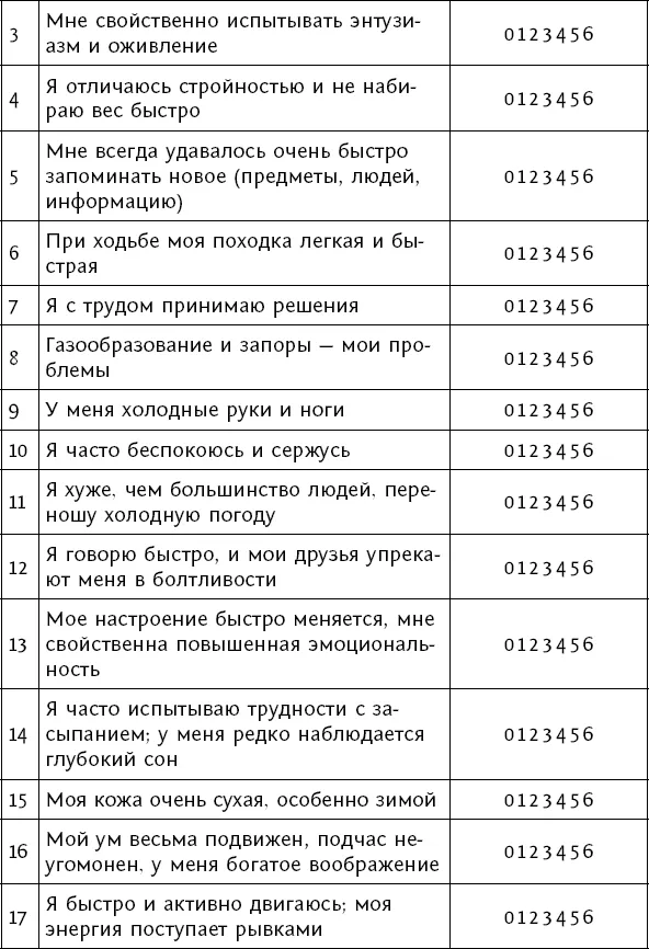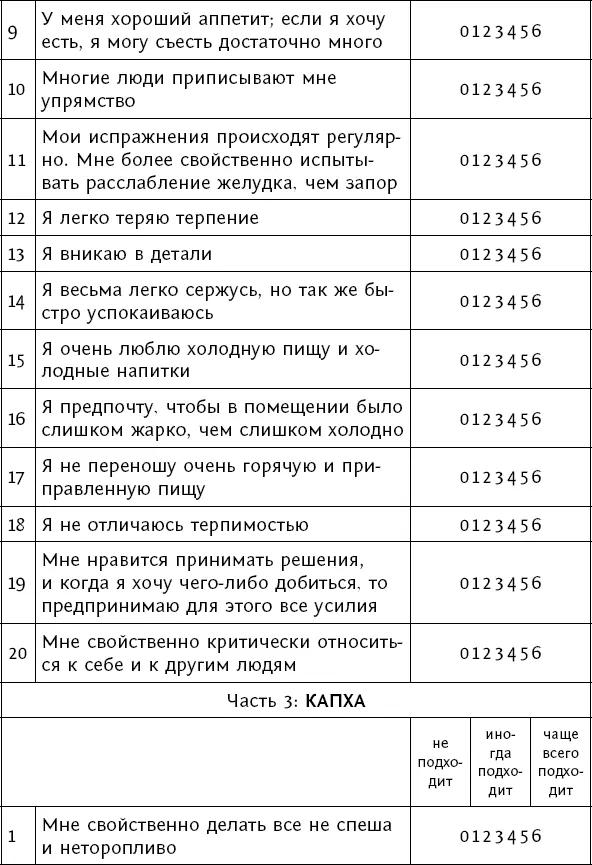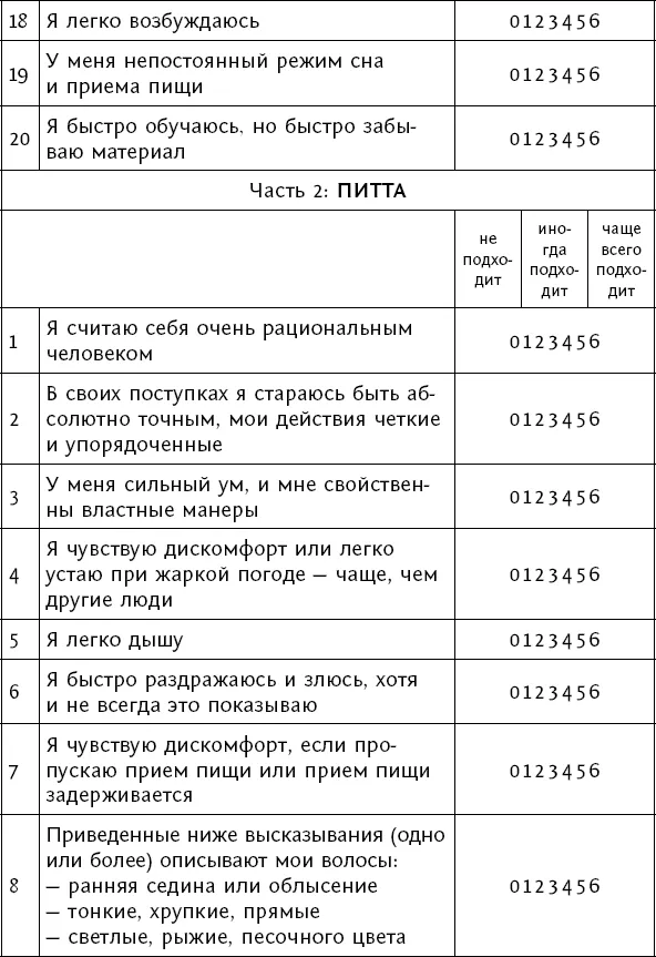 Люди с конституцией трех дош. Вата-питта-капха Данный тип считается самым редким. Проверьте свои ответы еще раз или попросите ответить на анкету за вас одного из своих друзей. Вам следует также ознакомиться с описаниями ваты, питты и капхи, приведенными в данной главе, чтобы определить, какая или какие две доши оказывают на вас большее воздействие.