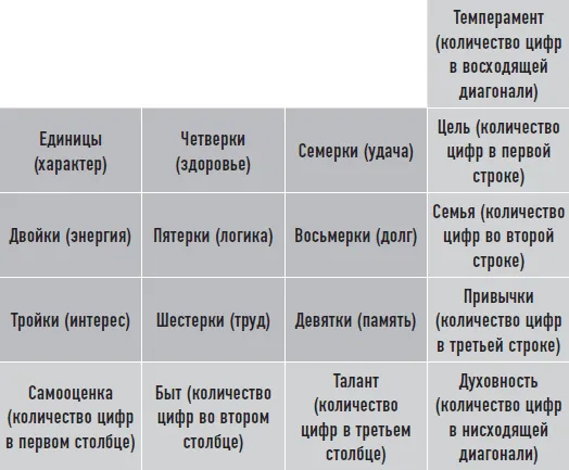 Теперь посмотрим, как истолковываются секторы матрицы Пифагора с точки зрения нумерологии. Каждая ячейка – это показатель какого-то качества личности человека. А количество цифр или их отсутствие (об этом чуть дальше) говорит о том, насколько выражено это качество в человеке.