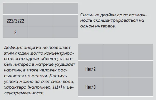 Очень противоречивый показатель сектора «Интерес», так как, с одной стороны, он указывает на хорошие начальные данные, возможность добиться впечатляющих успехов в науке; с другой – люди с такими цифрами в матрице зачастую раздираемы этими интересами. Они могут менять сферу деятельности, будучи не в состоянии остановиться на какой-то одной: интерес быстро вспыхивает, но так же быстро и угасает, оставляя привкус разочарования; интерес нестабилен. Если у вас три тройки в матрице, подумайте, какие науки притягивают вас больше всего, если они связаны, то вы можете превосходно реализоваться в междисциплинарных областях. Возможно, вы даже станете первым, кто обнаружит связи между какими-то науками и создаст новые отрасли.