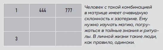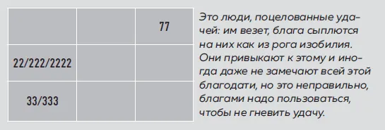Три семерки могут быть одновременно и даром, и проклятьем. Такие люди не столько пользуются удачей – они сами и есть удача для себя. Они могут управлять своей жизнью: то, что называется «быть кузнецом своего счастья», возведено в этом случае в абсолют; они знают, что принесет им счастье, и сами выстраивают к нему дорогу без тени сомнения. Собственно, сомнения и неверие в свои силы им противопоказаны; если вы видите такие показатели в ячейке, то даже не думайте разувериться в своей силе. Ваши мысли достойны того, чтобы их записать и опубликовать. Вы можете найти себя в сферах, связанных с людьми: преподавание, медицина, психология. Или займитесь наукой. Вы склонны идти напролом и в любом случае добиваться задуманного. Так же, как и 77, женщинам стоит сначала наладить личную жизнь, мужчинам – заняться карьерой.