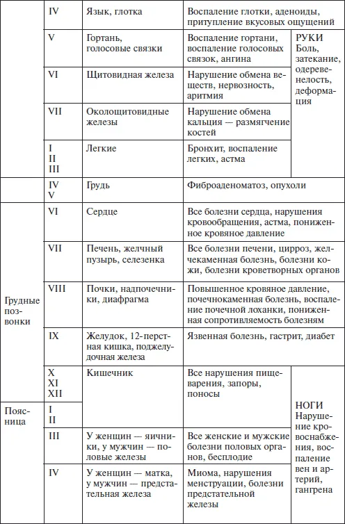 Для того чтобы подчеркнуть важность заботы о позвоночнике, приведу ниже в таблице отдельно по каждому позвонку его энергетическую зону действия и наиболее распространенные патологии.
