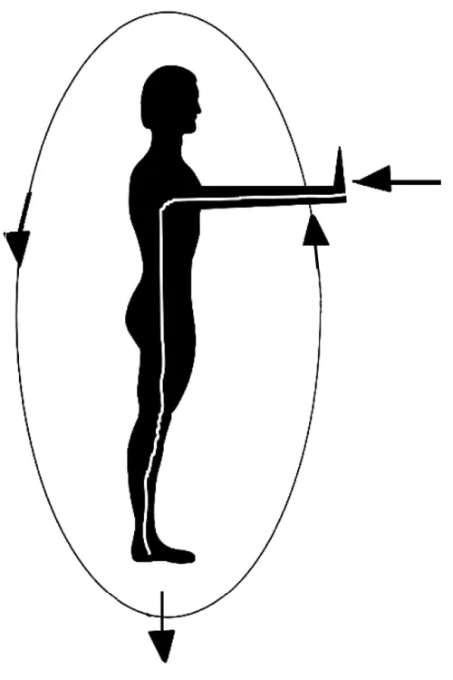Те, у кого работает обратный круг, проводят энергию по передней поверхности тела наверх, затем через шею вниз по спине (рис. 2 б), энергетическое кольцо замыкается, и энергия снова идет наверх. У них происходит забор энергии через точки входа и выхода рук и сброс энергии через точки входа и выхода ног. Эти люди обычно худые и нервные.