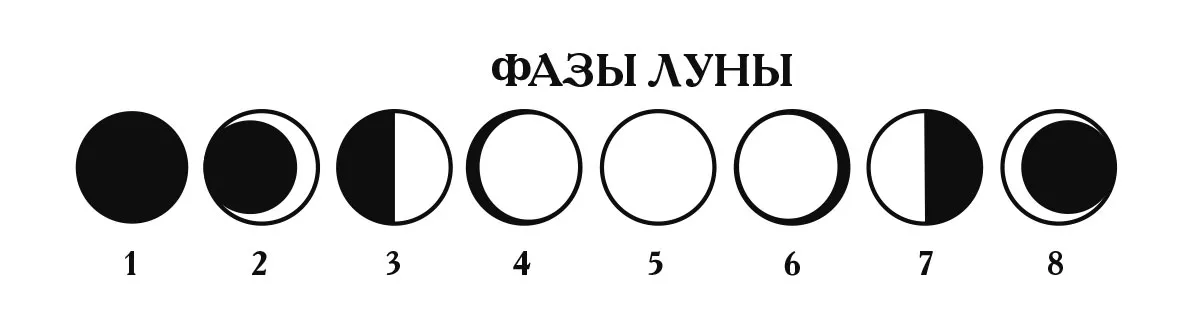 1 – Новолуние, 2 – серповидная Луна, 3 – первая четверть Луны, 4 – выпуклая Луна, 5 – Полнолуние, 6 – рассеивающая Луна, 7 – последняя четверть Луны, 8 – бальзамическая Луна.