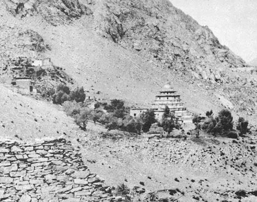 Ил. 6. Великая ступа в Джонанге. Одна из самых ранних фотографий Джонанга. Tucci (1973), ил. 78, где она ошибочно названа ступой Гьянг. Девачен, резиденция Долпопы, на фотографии наверху слева