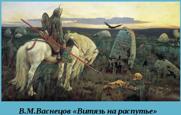 Вопрос выбора жизненного пути русским богатырём на холсте «Витязь на распутье» таит в себе роковой смысл. В каждом предписанном выборе таится манящая приманка-западня. «Правильный» выбор приманки – главное условие удачи каждой западни. Точно так же, как русский витязь на картине, и русский народ оказался на распутье в своём историческом развитии. Времени на раздумье не так уж и много. Мрачный фон картины как бы символизирует нависшую над всем человечеством угрозу самоуничтожения, хотя большинство людей этой угрозы не ощущают. Что люди видят на заднем плане картины? Закат, это на картине, или рассвет? Для кого как! Люди, ощущающие рассвет, выбирают духовный путь развития. Люди, предполагающие, что это закат, выбирают антидуховный путь развития. Остальные следуют предписанному3 выбору.