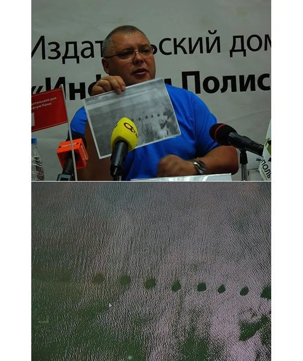 При этом была продемонстрирована фотография, скриншот с видеозаписи, которая велась при пролете мотодельтоплана 7 августа над дельтой реки Селенга в Кабанском районе Бурятии. На ней виден ряд темных кругов расположенных на расстоянии двадцати метров друг от друга и имеющих диаметр 7—8 метров.