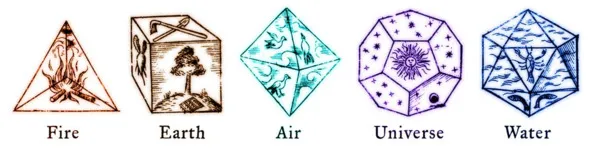Развивая теорию о пяти первоэлементах он, силой своей мысли, проникает в их строение. Сопоставляя, известные ему, пять простейших трехмерных форм правильных многогранников, позднее названных Платоновыми телами, он определяет соответствие их стихиям. В основу своего распределения Платон принимает критерии устойчивости и подвижности.