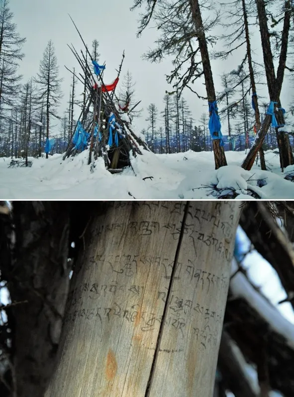 Внутри него размещен небольшой столбик из лиственницы. На нем нанесена молитва-обращение к жившему на этой возвышенности шаману. Надпись на тибетском языке.