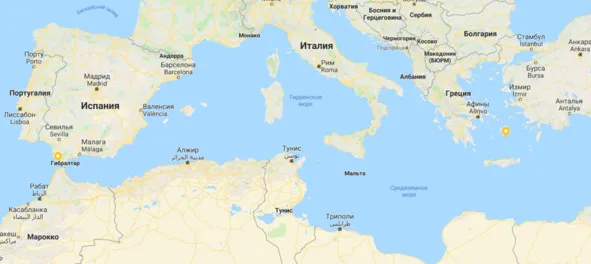 Карта Средиземного Моря, отмечены два возможных места нахождения Атлантиды – пролив Гибралтар (слева) и остров Тира (справа). На самом деле «возможных» мест куда больше. За две тысячи лет Атлантиду искали практически по всему земному шару. Изображение сделано с помощью сайта «https://maps.google.com»