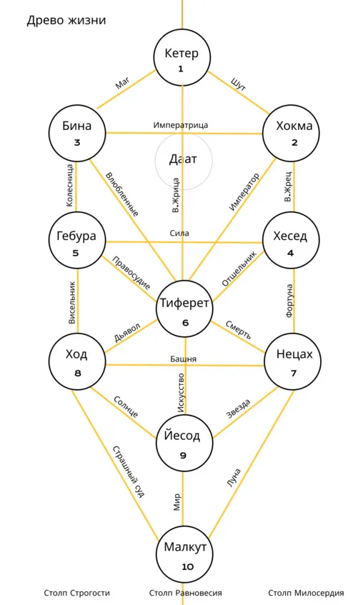 Древо жизни – диаграмма, использующаяся в Каббале и ряде родственных ей религиозно-мистических, оккультных и эзотерических течениях. Представляет собой 10 кругов (сфирот), выстроенных в три колонки («столпа») и соединенных 22 линиями.