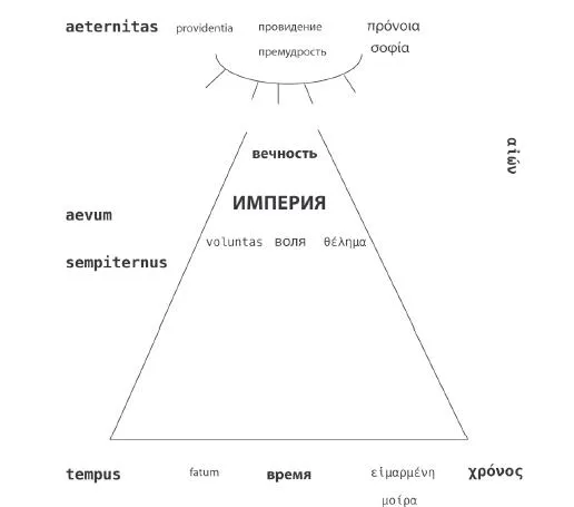 Вечность Рима (Roma Eterna) и вечность Империи следует понимать именно как aevum, но не как собственно божественную неизменность. Поэтому с Империей связана как раз воля, главное управляющее, упорядочивающее начало, которое является онтологически двояким и может быть направлено либо вверх, либо вниз. Царская Воля, обращенная к Богу, приближает Империю к вечности, позволяет Провидению, Замыслу полно и свободно реализовываться в мире явлений. Но эта Воля может быть обращена к Земле, вниз, и тогда Царство снисходит во время, становится зависимым от причинно-следственных процессов, оказывается под воздействием механического Рока.