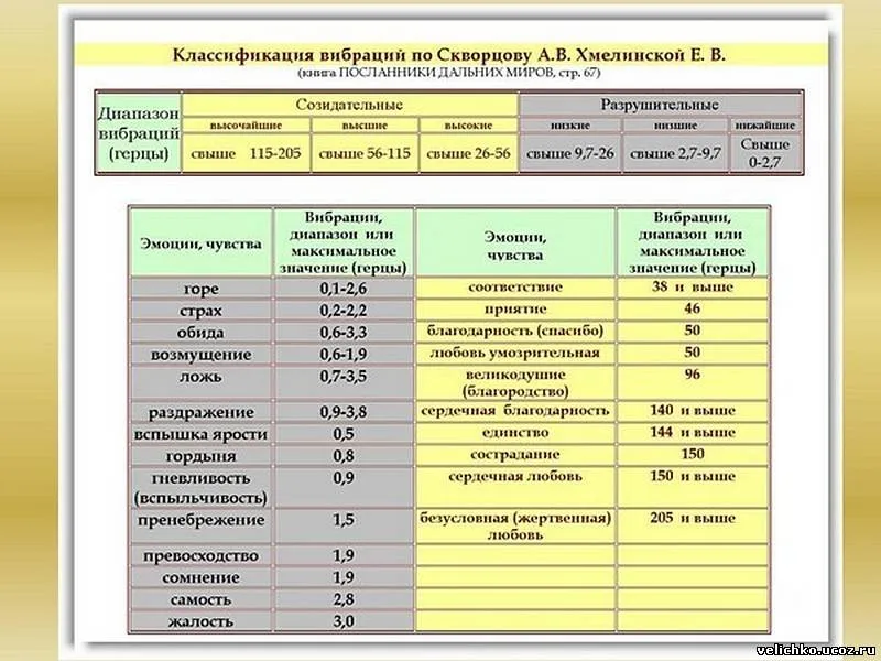 Сейчас посмотрю в сети. Нашёл такого человека Дэвида Р. Хокинса он разработал шкалу вибраций, только у него не в Герцах, а в каких-то единицах от 0 до 1000. Как измеряется всё это, не говорится. Есть ещё классификация по Скворцову:
