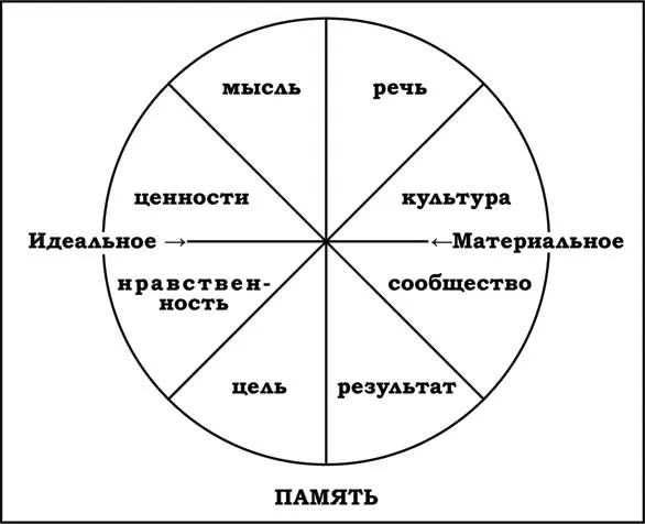 Приведенная схема (рис. 3) наглядно демонстрирует взаимосвязь: 1) мышления и речи; 2) ценностей и культуры; 3) морали как способности различать добро и зло и самой возможности существования сообществ людей; 4) цели и результатов человеческой деятельности. Кроме того, схема показывает переход каждого из атрибутов человеческого в человеке «в своё иное» (Гегель) – объективацию, воплощение и опредмечивание. Так, мысли опредмечиваются в практических результатах деятельности; смыслы и ценности – в интеграции людей в какое – либо сообщество; мораль и нравственность – в существовании цивилизации и культуры, несовместимой с цинизмом и вандализмом; цели формулируются посредством устной и письменной речи.